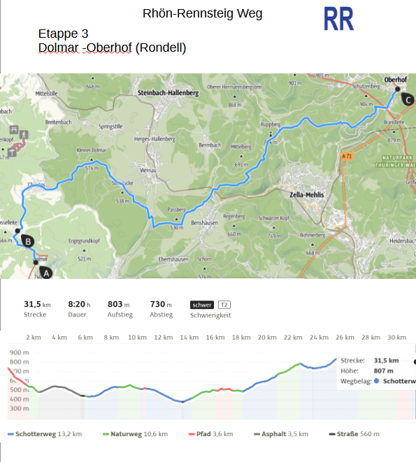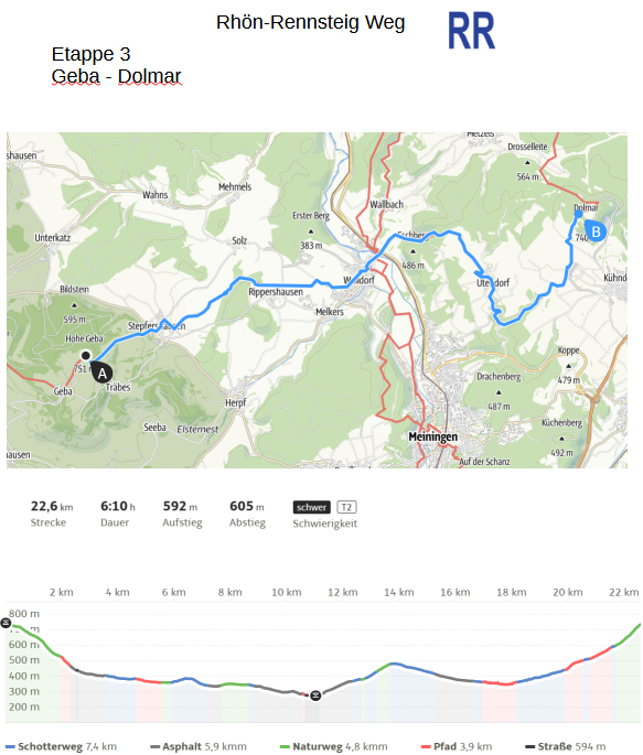 Die 3. Etappe führt von der Geba zum Dolmar. Bei Walldorf überquert der Rhön-Rennsteig Weg die Werra und verläßt die Vorderrhön und führt Richtung Dolmar (geologisch ein Ausläufer der Rhön, geographisch Beginn des Thüringer Waldes)